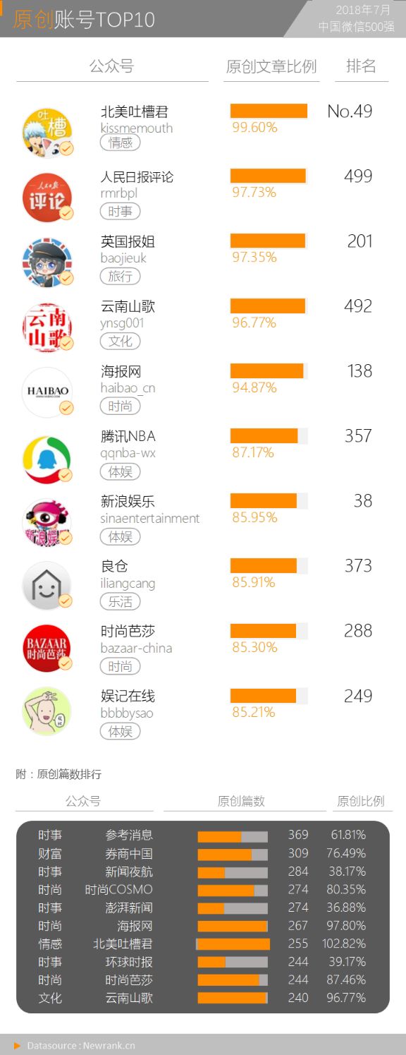 本月,“北美吐槽君”以99.6%的原创比例收获冠军。截止目前,已连续三个月未有100%原创账号。