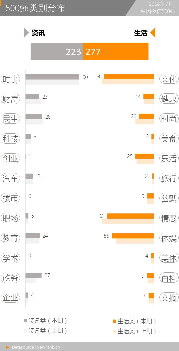 时事(90)、文化(66)、情感(62)、体娱(56)与民生(28)是7月500强中所占席位最多的类别位次。上述五强类别占据500强席位的60.4%。资讯与生活类账号的比例为1:1.2,差距有所减小。