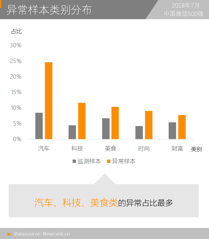 阅读数异常比例约占统计样本的3.6%,大多分布在新榜指数600-900区间,其中汽车、科技及美食类公众号异常比例较高。