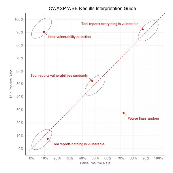 考虑到如果一个工具将每一行代码都标记为漏洞,则检测结果将会是100%的误报并且是没有价值的。如果该工具没有标记一个漏洞,则误报率为0,但是它也没有报出任何一个真实的漏洞,这也是没有价值的。如果一个工具随机报告每个测试是否包含漏洞,则将具有50%的真实漏洞,和50%的误报。
