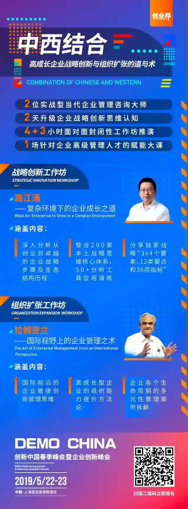后来,在老板的一再追问下,我只好和盘托出,并给他推荐了我背后偷师的两位实战型当代企业管理咨询大师,他们即将现身在5月22日—23日举办的创业邦2019 DEMO CHINA创新中国峰会暨企业创新峰会上,为我们带来两堂针对企业高级管理人才的赋能大课,4+3小时面对面封闭性领导力工作坊推演,2天升级企业战略创新思维认知……可够我们好好学的!