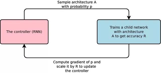 左边有一个名为「控制器」(the controller)的 RNN,它设计出一个「child」的模型架构(雷锋网觉得可以称之为「雏形/子架构」),而后者能够通过某些特定任务进行训练与评估。随后,反馈的结果(feedback)得以返回到控制器中,并在下一次循环中提升它的训练设定。这一过程重复上千次——生成新的架构、测试、再把反馈输送给控制器再次学习。最终,控制器会倾向于设计那些在数据集中能获得更高准确性的架构,而反之亦然。