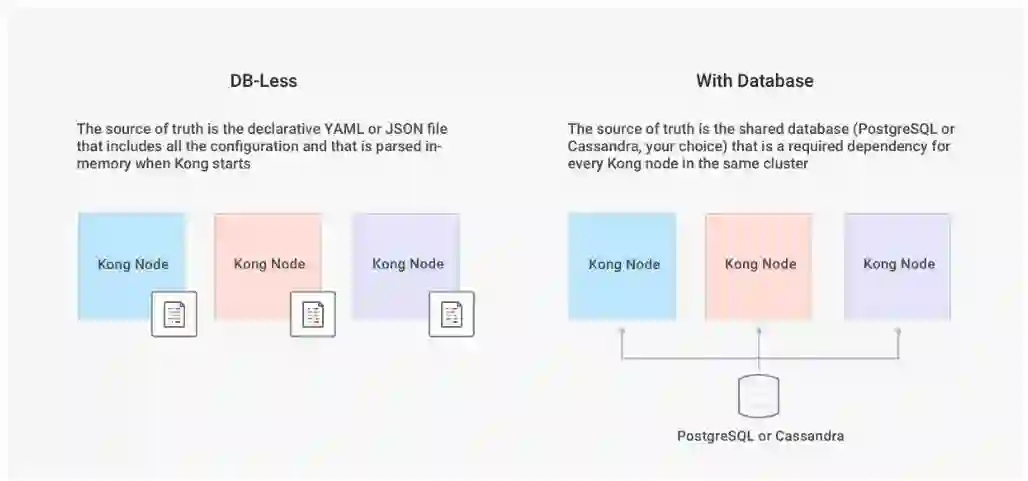 通过使用单个 YAML 或 JSON 文件存储 Kong 配置,消除数据库开销和依赖关系。