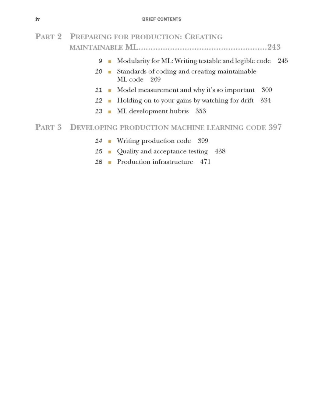 - 第2部分(第9-13章)介绍了ML项目的开发过程。通过ML解决方案开发的示例(好的和坏的),本节将带您了解经过验证的构建、调优、日志记录和评估ML解决方案的方法,以确保您构建的是最简单和最易维护的代码。