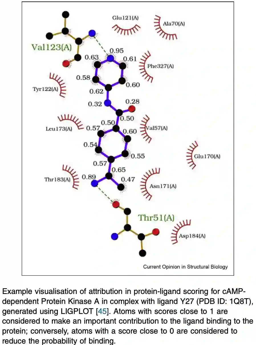 建立对基于结构的虚拟筛选方法的更大信任的一个关键步骤是,开发允许用户了解配体的哪些特征意味着模型预测它会结合的方法(下图显示了一个示例蛋白质-配体复合物,该复合物已被分配了这样的属性)。