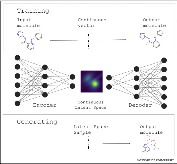 然而,即使可以使用现有的计算技术,例如对接算法和分子动力学模拟,这个过程也是昂贵且耗时的。深度生成模型越来越多地被提议作为分子设计的替代方法。这些方法旨在能够快速生成多个高亲和力结合剂。下图展示了用于药物发现的深度生成模型的示意图