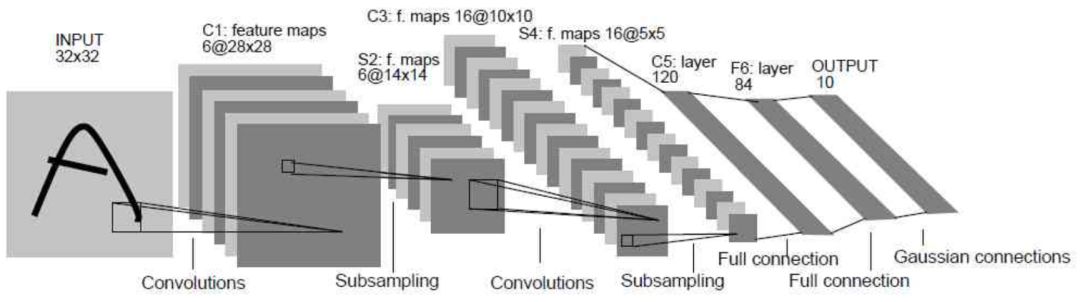 卷积神经网络的开山之作LeNet于1998年被提出,并成功应用于手写体识别。LeNet和现在的网络结构相比虽然简单(如上图所示),但是卷积层、池化层和全连接层这些基本模块都已经具备。