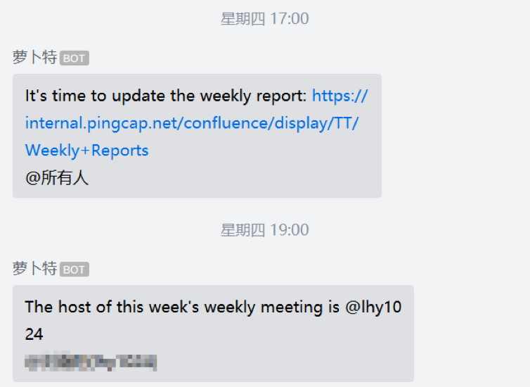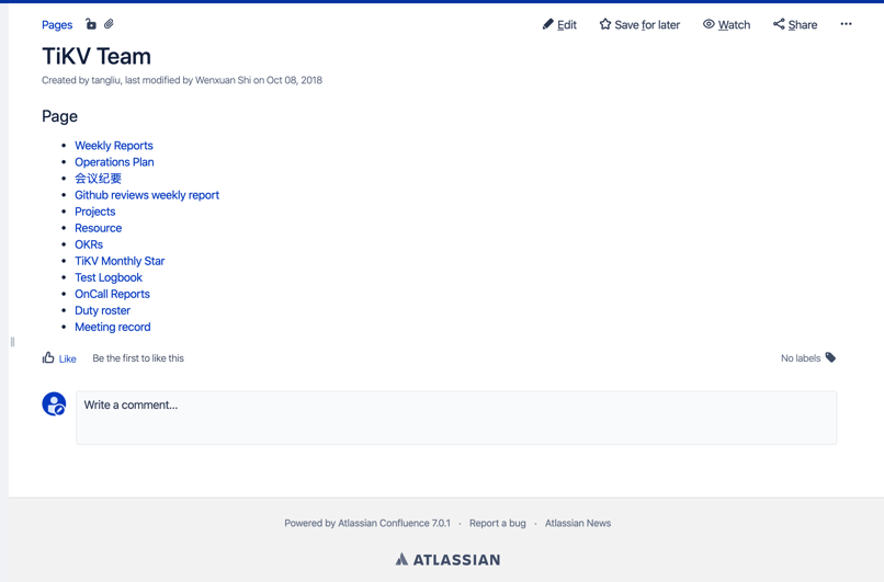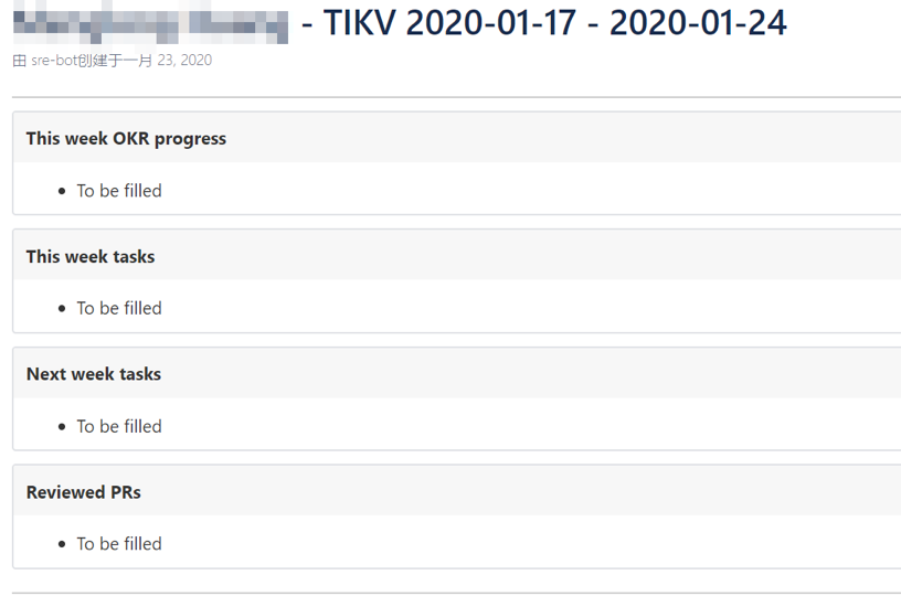 在 PingCAP 各个团队(包括虚拟团队)大大小小一定都会有例会,通常以周为单位,有些比较重要且紧急的项目会以天为单位,会议的时间和长度也不一定。周会是一个很好的机会能让团队成员互相了解大家在干嘛,对于 Manager 也能很好的知道方向有没有歪,进度是否正常。