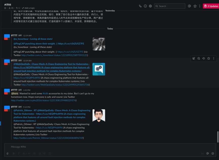 我们的 IFTTT 机器人在收集提及 TiDB、PingCAP 的推文