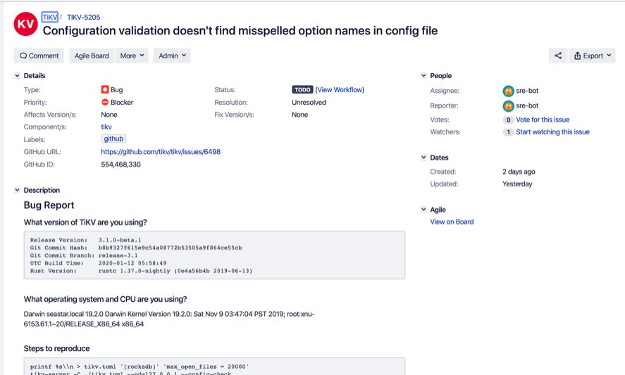 修 Bug 的流程也类似,值得一提的是我们开发了一个 bot,用于同步 GitHub 中来自社区的 Issue 到内部的 JIRA 中。