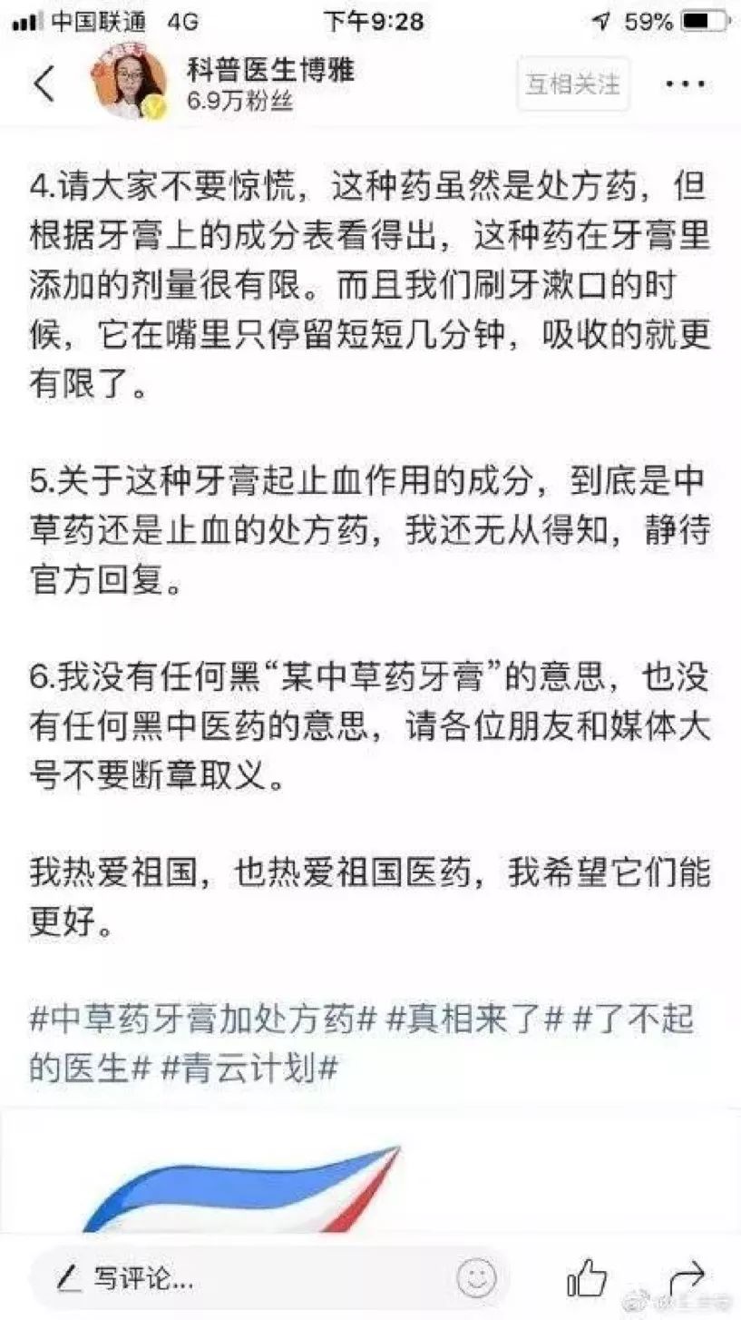 大概爆料此事的血液医生也没有想到,自己一个小小的质疑竟然掀起了这么大的讨论热度,不但激起了网友们对消费品的不安情绪,还招来了很多人的质疑:“黑”云南白药、“中医黑”、文章太有煽动性、背后有商业利益......