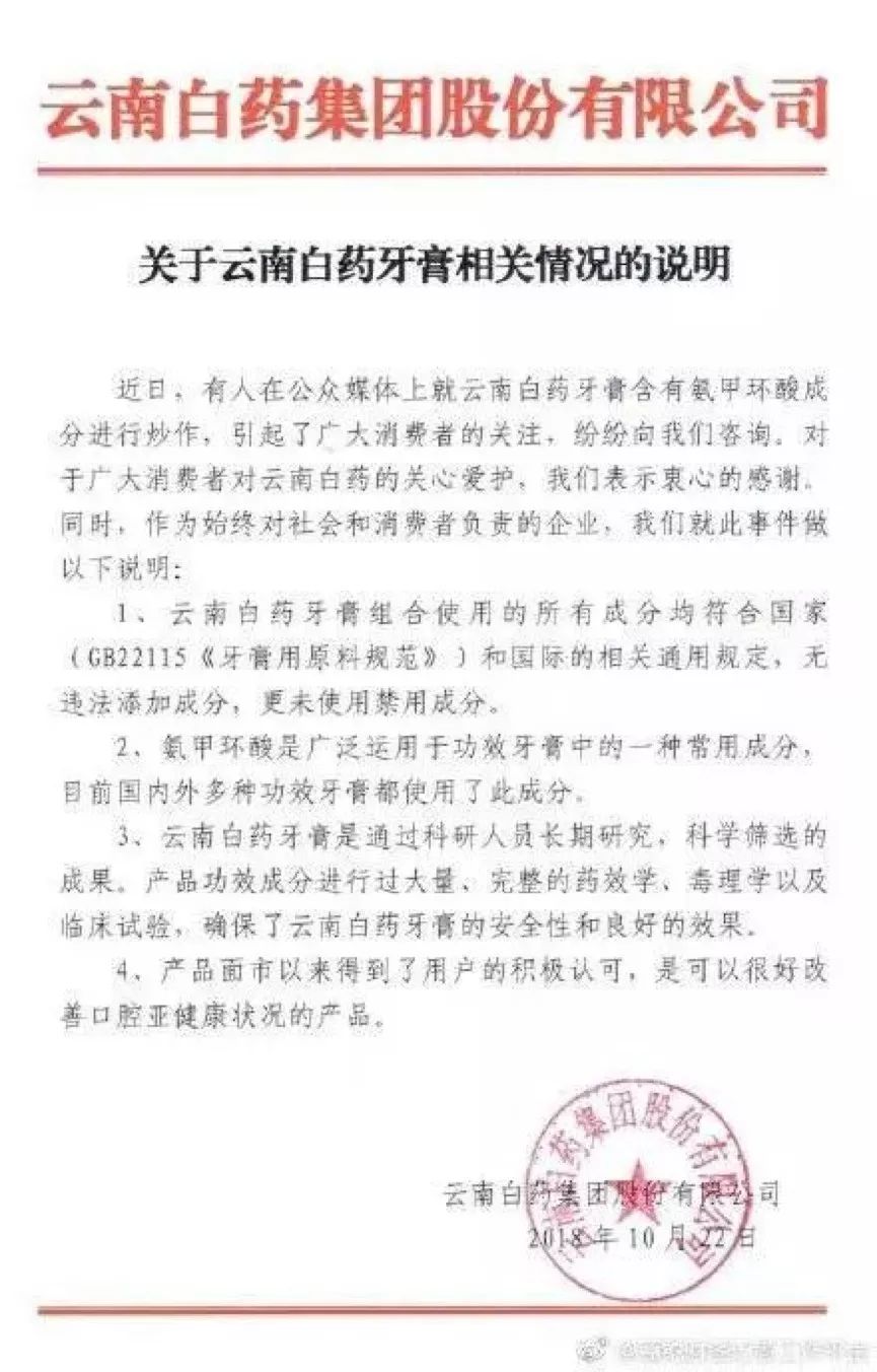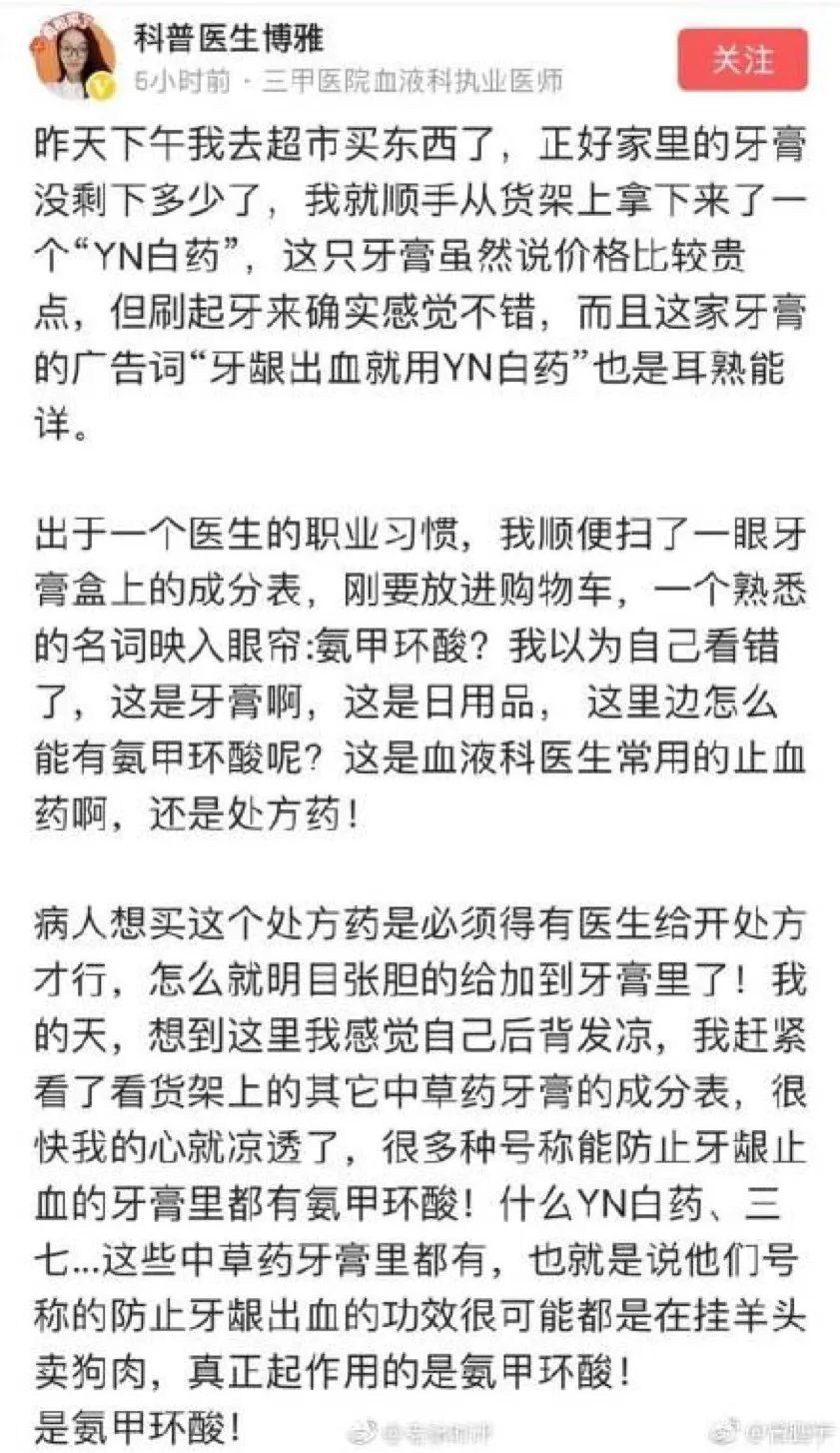10月22日,一位微博名为“科普医生博雅”的三甲医院血液科执业医师发表微博称,所谓专治牙龈出血的云南白药牙膏,其中含有西药处方药成分氨甲环酸,这类药物常用于血液科医生止血,不宜出现在日用品之中。