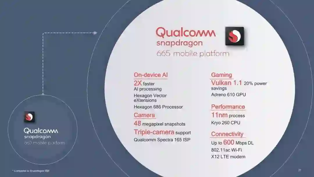 骁龙665是前年推出的主流手机明星级平台骁龙660的升级版,采用三星11nmLPP工艺制造。