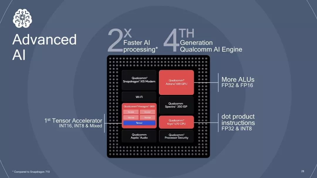 最重大的变化是AI方面,集成最新Hexagon688 DSP,包括高通的张量加速器,可用于机器学习推理,搭配高通第四代AI引擎,AI处理性能提升2倍。