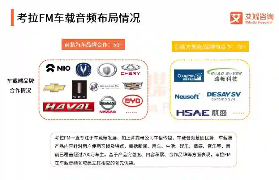艾媒咨询的数据显示:从车载端的布局情况来看,考拉FM丨听伴已经与50家主机厂达成合作,累计激活车载设备700万+,已经签署独家合作协议的车企未来将覆盖5000万辆智能网联汽车。