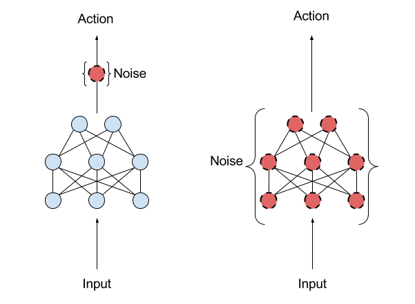 参数噪声方法是将自适应噪声加在神经网络策略的参数中,而不是加在行为空间。传统的增强学习(RL)利用行为空间噪声来改变智能体每一刻执行的动作的可能性。参数空间噪声使智能体的参数直接增加了随机性,改变了智能体做出的决策的类型,使它们总是能完全依赖于对当前环境的感知。这种技术介于进化策略(可以控制智能体的参数,但是当它在每一步中探索环境时,不会再次影响它的行为)和类似TRPO、DQN、DDPG这样的深度增强学习方法之间 (不能控制参数,但可以在策略的行为空间上增加噪声)。