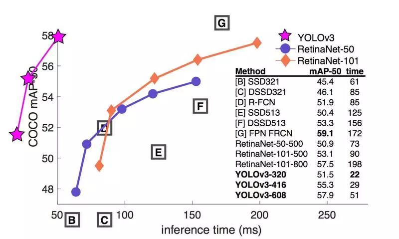 图 2 以 0.5 IOU 为指标的速度与准确率关系曲线(mAP vs 推断时间)。从图中可以看出 YOLOv3 准确率高,速度也快。