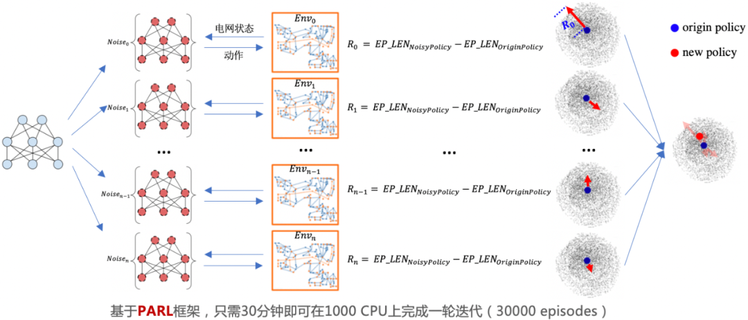 的较大规模神经网络进行进化学习。在此过程中,需要先对网络参数进行不同的高斯噪声扰动,然后将扰动后网络作为专家系统新的动作打分模型,分别和电网系统进行交互,并计算噪声扰动后网络相比原始网络在电网系统中的平稳运行时长增益,作为该采样噪声的奖励;最后,整合不同噪声方向的奖励来决定下一轮网络参数的进化方向。据悉,一个这样的电网调度打分模型需要进行 60 万个 episode 迭代, 合计总的电网模拟时长一万多年,包含 10 亿多步探索。而这些仅仅需要 10 个小时左右的时间就能完成。