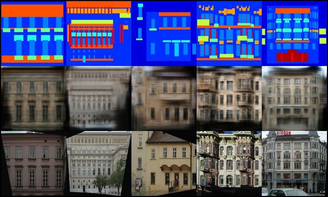 第一行展示了生成器的条件,第二行展示了输出,第三行展示了条件对应的真实图像。