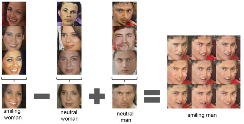 关于 DCGAN,最值得一提的是这个架构在大多数情况下都是稳定的。这是第一篇使用向量运算描述生成器学习到的表征的固有性质的论文:这与 Word2Vec 中的词向量使用的技巧一样,但却是对图像操作的!