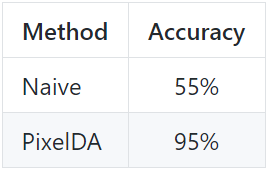 PixelDA 在 MNIST 上训练一个分类器,并可以变换到和 MNIST-M 相似的图像(通过执行无监督的图像到图像域适应)。该模型和在 MNIST 上训练分类器并在 MNIST-M 上评估的朴素方法对比。朴素方法在 MNIST 上取得了 55% 的准确率,而在域适应上训练的模型获得了 95% 的分类准确率。