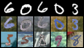 第一行展示了 MNIST 域的原始图像。中间行展示了第一行图像的变换版本。最后一行展示了 MNIST-M 域的图像示例。