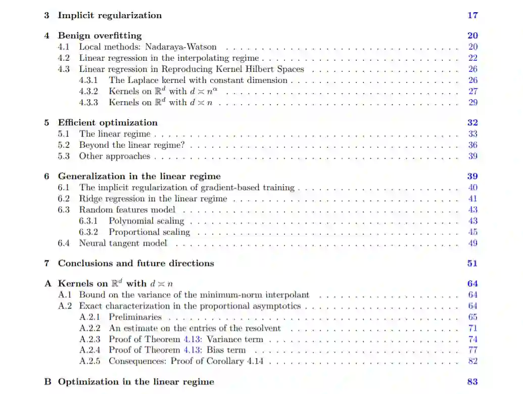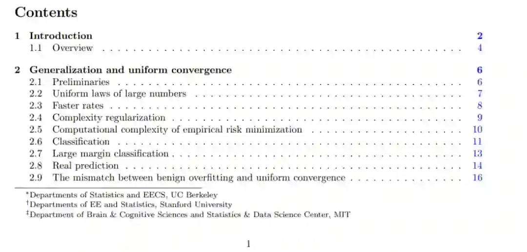 深度学习在实践中的显著成功,从理论的角度揭示了一些重大的惊喜。特别是,简单的梯度方法很容易找到非凸优化问题的接近最优的解决方案,尽管在没有任何明确的努力控制模型复杂性的情况下,这些方法提供了近乎完美的训练数据,这些方法显示了优秀的预测精度。我们推测这些现象背后有特定的原理: 过度参数化允许梯度方法找到插值解,这些方法隐含地施加正则化,过度参数化导致良性过拟合,也就是说,尽管过拟合训练数据,但仍能准确预测。在这篇文章中,我们调查了统计学习理论的最新进展,它提供了在更简单的设置中说明这些原则的例子。我们首先回顾经典的一致收敛结果以及为什么它们不能解释深度学习方法的行为方面。我们在简单的设置中给出隐式正则化的例子,在这些例子中,梯度方法可以得到完美匹配训练数据的最小范数函数。然后我们回顾显示良性过拟合的预测方法,关注二次损失的回归问题。对于这些方法,我们可以将预测规则分解为一个用于预测的简单组件和一个用于过拟合的尖状组件,但在良好的设置下,不会损害预测精度。我们特别关注神经网络的线性区域,其中网络可以用一个线性模型来近似。在这种情况下,我们证明了梯度流的成功,并考虑了双层网络的良性过拟合,给出了精确的渐近分析,精确地证明了过参数化的影响。最后,我们强调了在将这些见解扩展到现实的深度学习设置中出现的关键挑战。