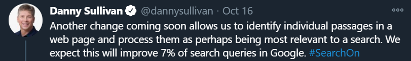 另一个即将到来的变化是,谷歌搜索将能够识别网页中的单个段落,并将它们处理为与搜索最相关的段落。我们预计这会改善 7%的 Google 搜索查询。
