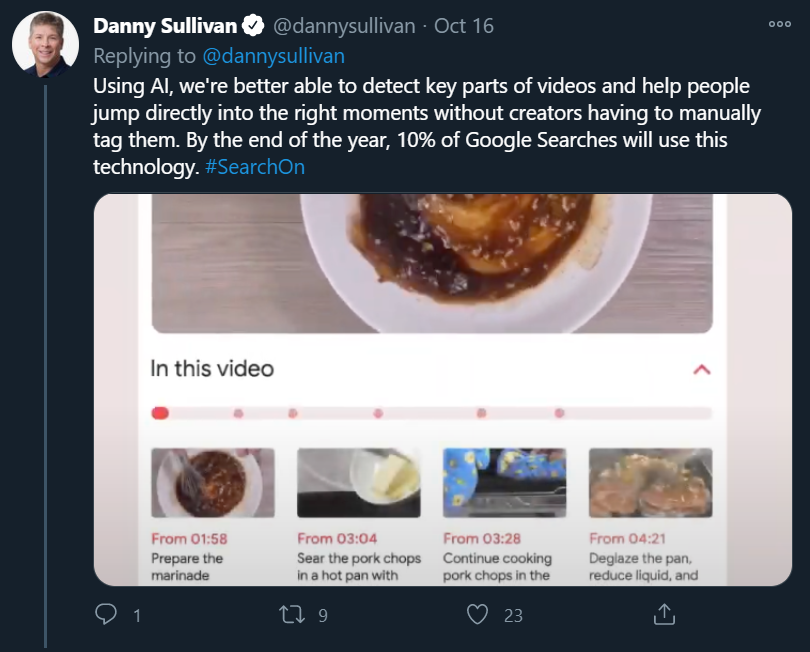 使用人工智能,我们可以更好地检测视频的关键部分,并帮助人们直接跳到感兴趣的内容,而不需要创作者手动标记。到今年年底,10% 的谷歌搜索将使用这项技术。