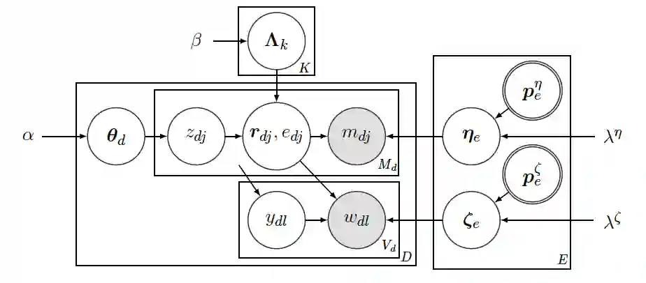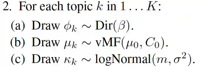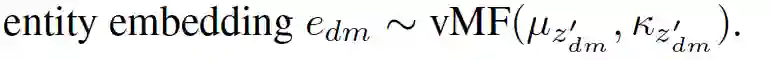 由于一些知识表示(TransE)是unit sphere,因此使用von Mises Fisher(VMF)分布对其进行建模。vmf分布被广泛用于模拟此类定向数据。此外,使用vmf分布代替多元高斯分布,可以更有效地进行推断。与传统LDA模型相比,增加一组参数:(μk, κk) ,主题k的vMF分布;以及edm,即文档中实体的知识表示向量。