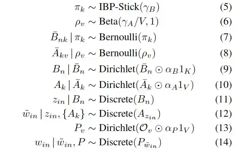 推导了一个B、B-、A、A-和P(以及添加和删除主题)的 blocked-Gibbs sampler。然而,单是吉布斯抽样并不能使主题概念词矩阵中的稀疏性足够快。混合速度很慢,因为阻塞的吉布斯取样器设置Akw~=0的唯一时间是没有w~计数分配给任何文档中的主题K时。当有海量文档时,不太可能达到零计数,采样器稀疏主题概念词矩阵A的速度会很慢。因此本文引入了一个MH procedure,通过在A和P上的 joint moves,鼓励主题概念词矩阵A向更大稀疏的方向移动。分布如下: