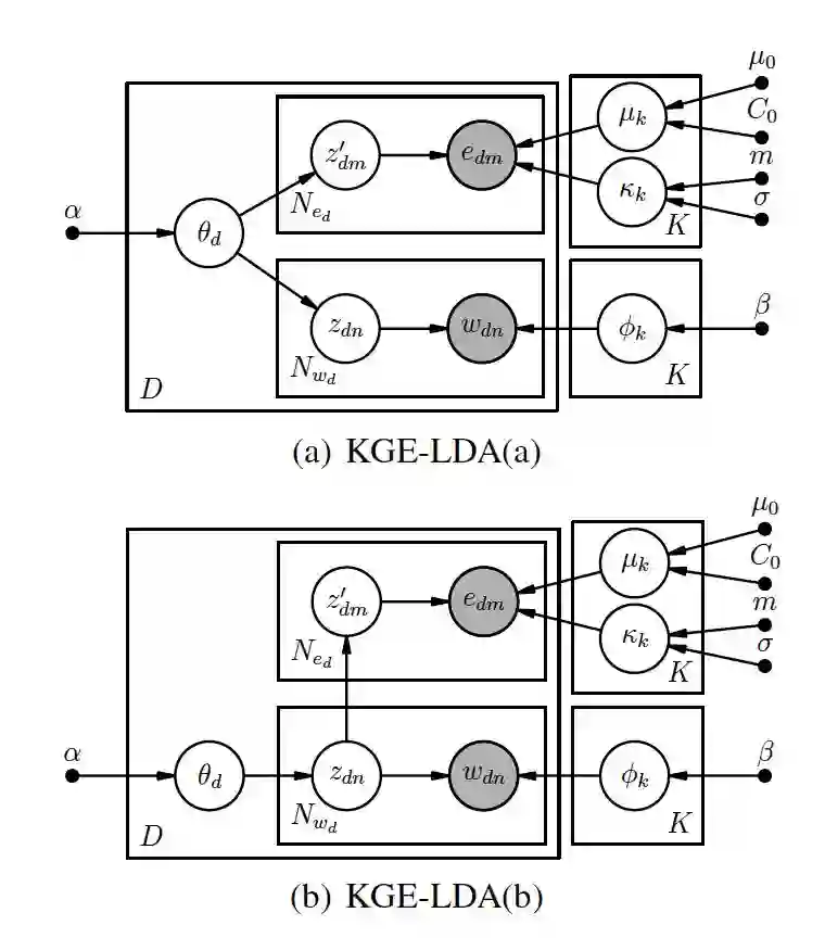 概率主题模型可用于从文档集合中提取低维主题。然而,以往的模型往往产生无法解释的主题。近年来,已有许多基于知识的主题模型被提出,但它们不能很好的处理知识图中的三元组,大部分以must-link形式,或直接利用图谱中的上层概念,无法在向量空间中量化。本文将知识表示嵌入到到LDA中,将潜在的Dirichlet分配(一种广泛使用的主题模型)与实体向量编码的知识相结合,来提高了主题语义的一致性和连贯性。本文主要在两个以往研究(CI-LDA和Corr-LDA)上做了改进,上图为linkKGLDA,下图为corrKGLDA: