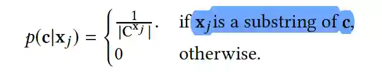 整个p(c|d)的计算过程重点在于第三步,即想要计算p(c|x),必须存在以上下文xj作为子串的概念词(这样的概念词来自于query log),如: