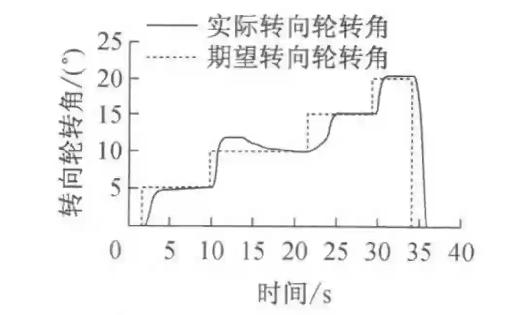 相比行驶时转向轮受到的回正力矩主要由侧向力产生,原地转向时回正力矩主要由轮胎与地面的摩擦阻力矩产生,故将原地转向角跟踪试验独立进行。试验过程中期望转向轮转角每 5° 一次阶跃直到 20°。
