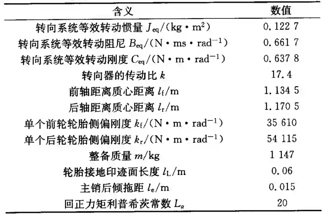 仿真试验是在软件 Simulink 环境下通过搭建转向系统模型实现的。同样的实车参数被用于仿真试验,车辆参数见表 1 所示。