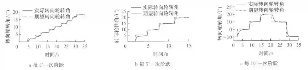 由于试验场地原因,车速在 20 km/h 左右。试验中期望转向轮转角为每 2° 一次阶跃直到 20°,见图 8a;每 5° 一次阶跃直到 20°,见图 8b;每 10° 一次阶跃直到 20°,见图 8c。