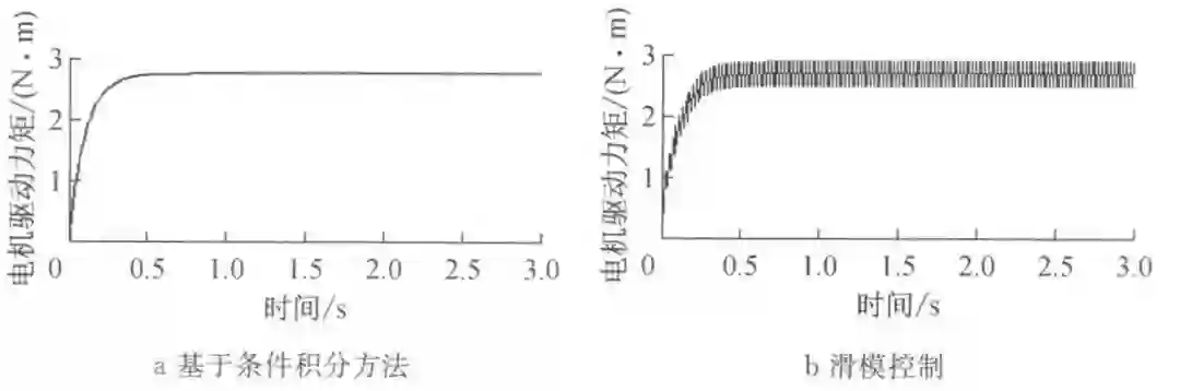 同时根据图 4a 和图 4b 中电机驱动力矩的对比也可以发现,当基于滑模控制算法时,电机驱动力矩波动比较大。对于转向系统而言,转向轮转角的波动会影响驾驶和乘坐感觉,电机驱动力矩的频繁波动会影响电机的寿命。