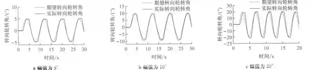 由于试验场地原因,车速在 20 km/h 左右。试验中期望转向轮转角周期为 4 s(见图 9),幅值分别为 5°(见图 9a),10°(见图 9b),20°(见图 9c)的正弦信号;期望转向轮转角周期为 8 s(见图 10),幅值分别为 5°(见图 10a),10°(见图 10b),20°(见图 10c)的正弦信号。