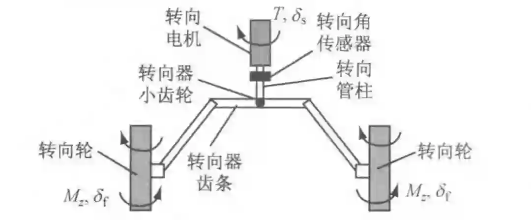 本文研究对象是齿轮齿条式的线控转向系统,驱动电机作用于转向管柱上,来控制转向系统转向轮转角,如图 1 所示。