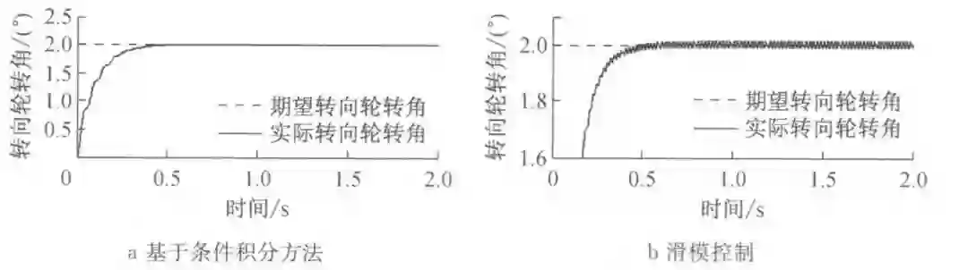 因此从图 3a 和图 4a 可以看出,基于条件积分方法的前馈加抗积分饱和的状态反馈控制算法在满足精度的同时,能平滑地实现转向轮转角的跟踪控制。