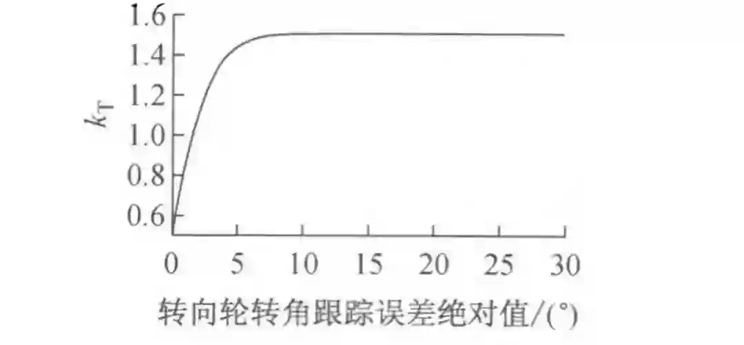 为防止有过大的超调量出现,根据转向轮转角跟踪误差的绝对值来改变是 T 的取值,是 T 的取值随跟踪误差的绝对值增大而增大直到 1.5 为止,如图 6 所示。