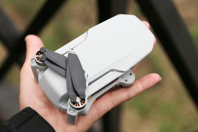 首先当然是主体飞机本身了,先说说外观方面,第一感觉就是大疆很“御”派的设计,折叠式的机身,主打收纳便携性的产品。机身材质方面,都是采用超轻材质,毕竟要控制在 249g 的重量,这是一个硬性的标准。Mavic Mini 折叠后就一手掌的大小。