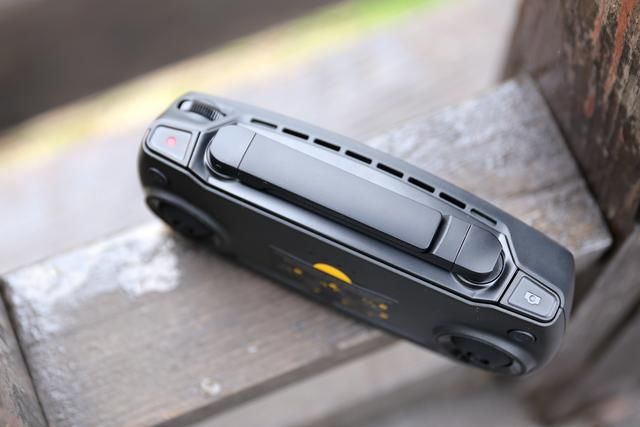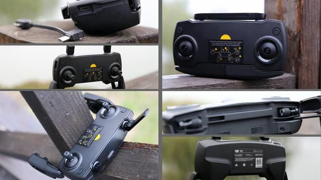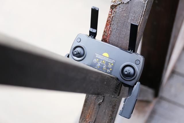 细节方面,整体手感还是很不错的,折叠设计的很优秀,在两个天线处还设计了一个卡扣用来卡紧收纳后的天线。然后按键方面, 除了两个可以进行自定义的方向导航操纵杆之外,还有开关机按键、返航按键,两个方向摇杆分别控制前进后退,上升下降以及转向等,在侧面有一个拨轮是控制云台相机上下,然后录像按键和拍照按键分别置于两侧。