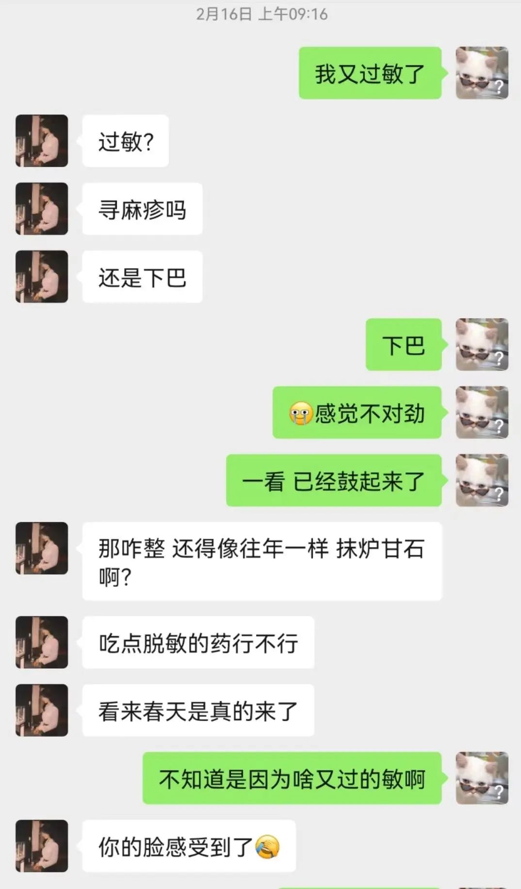 可能因为我经常过敏,在朋友圈里出了名,周围人过敏都会想到我,过来和我倒苦水。我也比较能理解那种难受,反过来能多关心他们一点。真的希望大家可以理解一下我们这种过敏的人,我们的身体已经很遭罪了,就不要给我们心理再添阴影了。