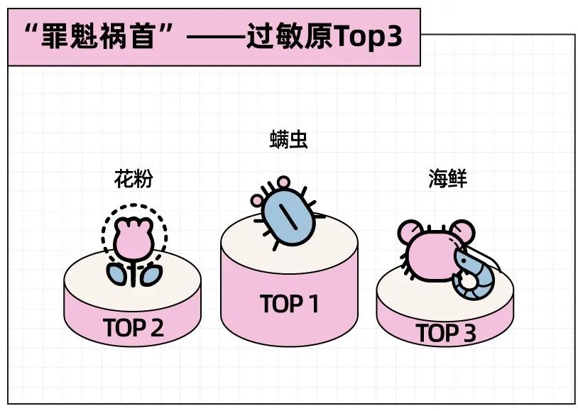 都是生活中常见的过敏原,在我们的调查中,让过敏患者饱受困扰的过敏原排名前三的分别为:螨虫、花粉、海鲜。