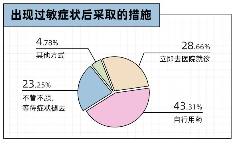 在调查中,只有不到三成的参与者在出现过敏症状后会立即前往医院就诊,大部分患者会凭借经验判断或者此前的就诊经历自行用药,甚至不做处理,等待症状消退。