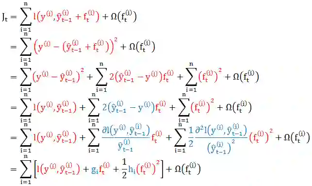 传统 GBT 在优化时只用到一阶导数信息,XGBoost 则对代价函数 Jt 进行了二阶泰勒展开 (忽略常数项),同时用到了一阶和二阶导数。以平方损失函数 l = (y-y^)2 为例
