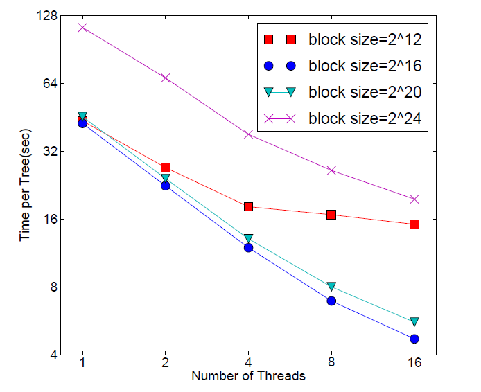 在近似算法的缓存优化中,我们需要找到一个块里的最优数据数量 (block size),如果数据量太小,在并行化时效率不高,如果数据量太大,很容易照成 cache miss。从上图可看出,最优 block size 是 216(蓝色圆形)。