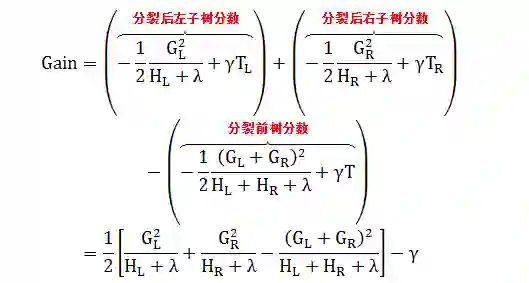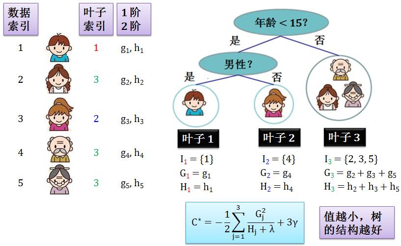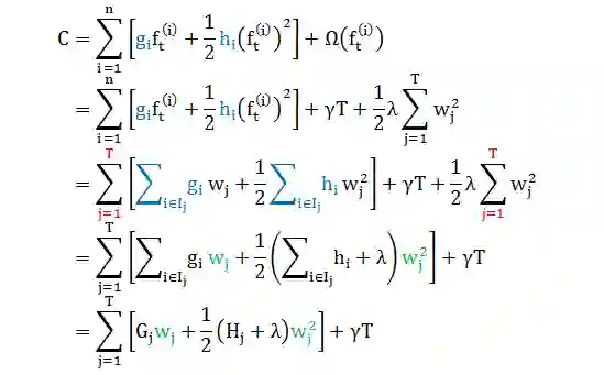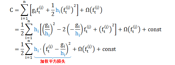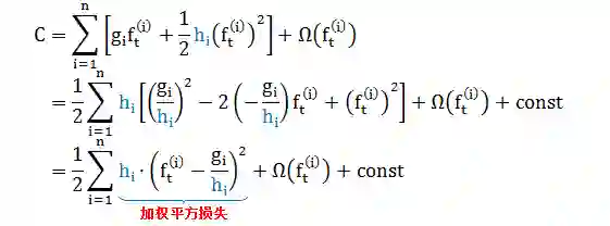 上面证明从“损失函数是平方形式的特殊情况”泛化成“任何损失函数的一般情况”,对第 i 个数据来说,gi 和 hi 是损失函数 l 对“第 t-1 轮的预测值”的一阶导和二阶导。