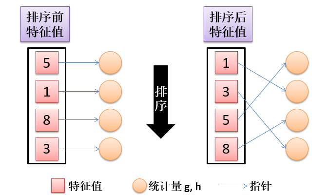 在 2.3 节讲到的 XGBoost 算法需要收集每个数据对应的 g 和 h,但是在排序之后,顺着行索引来获取的 g 和 h 不在连续的存储上,如下图: